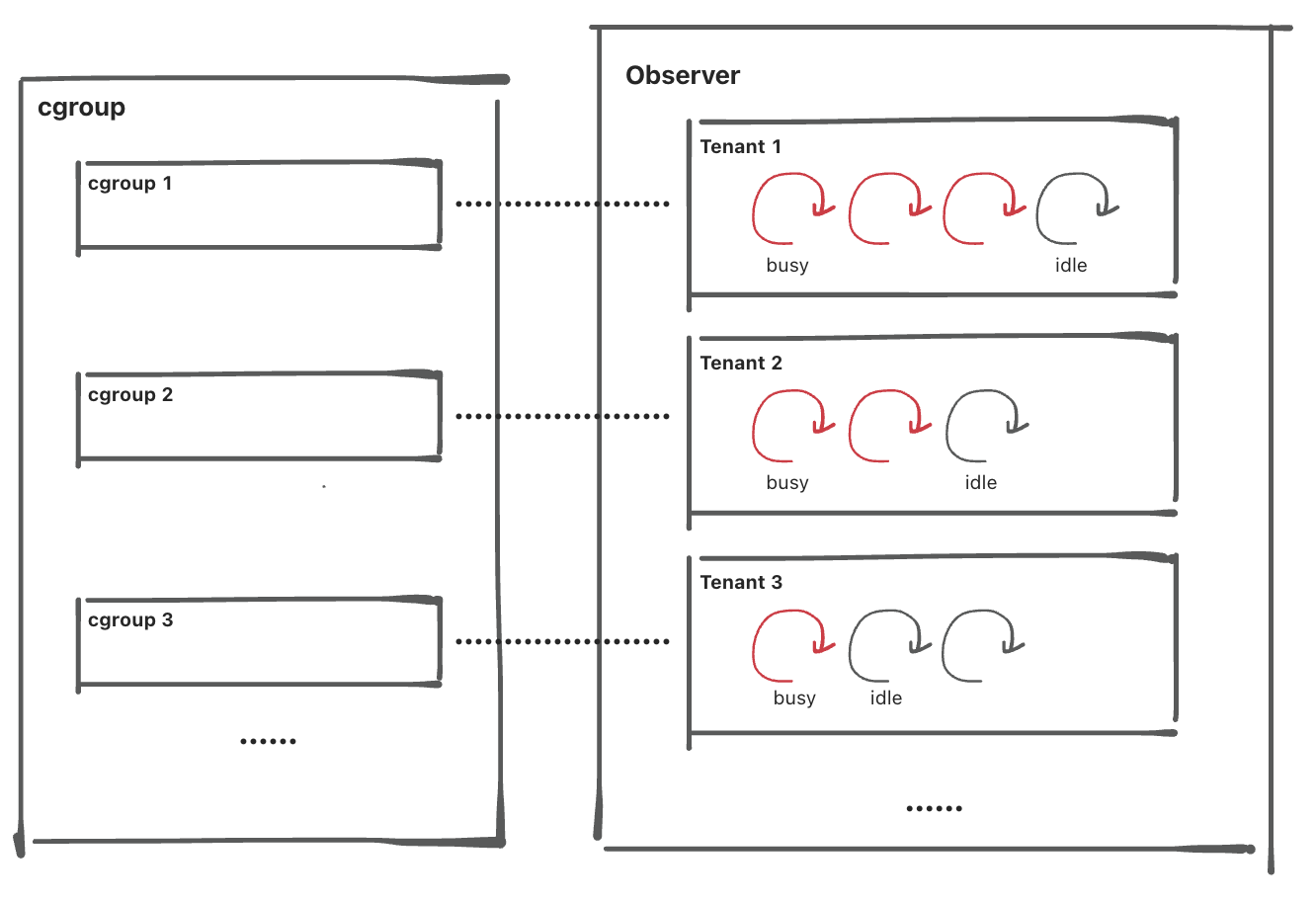 为了更好的隔离效果,后台线程也会放到不同的 cgroup 目录内,实现租户间隔离,租户内和工作线程隔离。